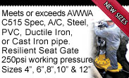 • Standard valve body installs on full range of pipe sizes and types (Steel, PVC, C900, CL, DI, AC)